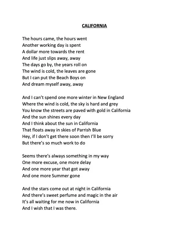 California Music and lyrics by N. LundbechCopyright NEEDAll rights reserved Contact ACM Back to ACM Catalog